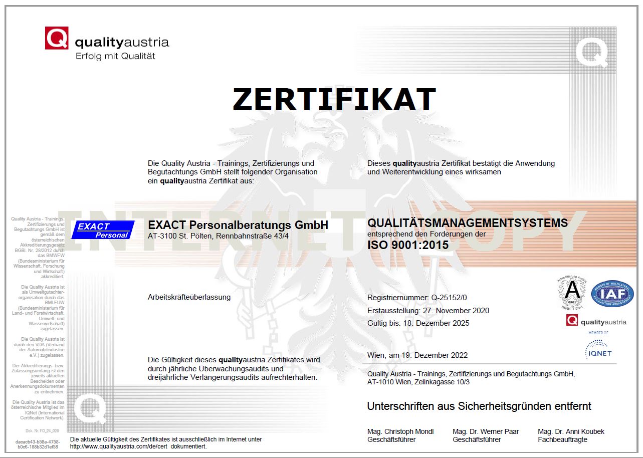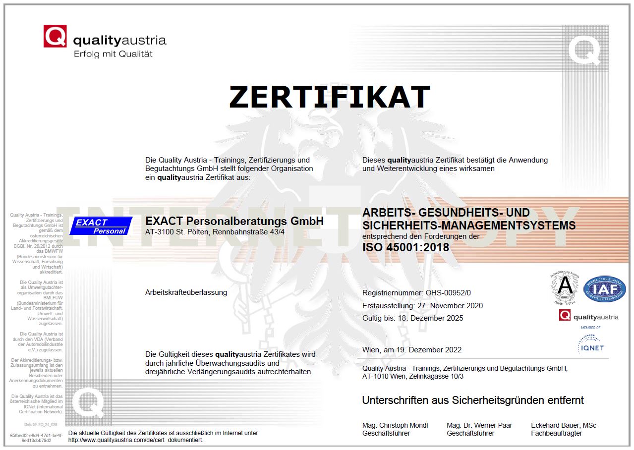EXACT Personalmanagement verfügt über anerkannte Qualitäts- und Sicherheitszertifizierungen, die unsere Arbeitsweise, Prozesse und Standards bestätigen.